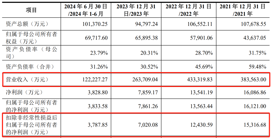 我们来看业绩,收入的话,38个亿、43个亿、26亿、12亿,那他是大幅下滑的这么一个业绩,2023年比2022年下滑了应该40%左右。利润也是逐年大幅下滑,1.53亿、1.24亿、7,000万,那基本上是2022年下滑了大概15%,然后2023年又下滑了40%左右。